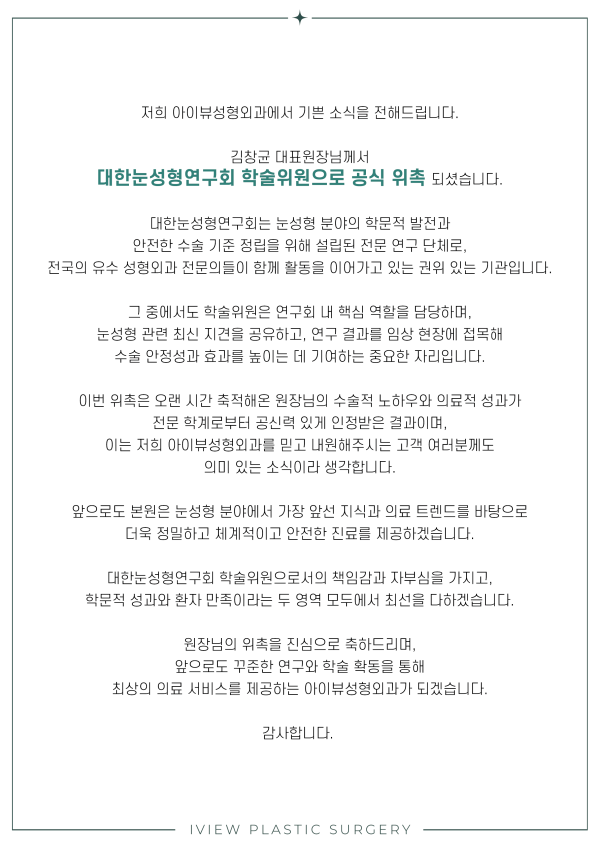 대한눈성형연구회 학술위원으로 공식 위촉 되셨습니다.